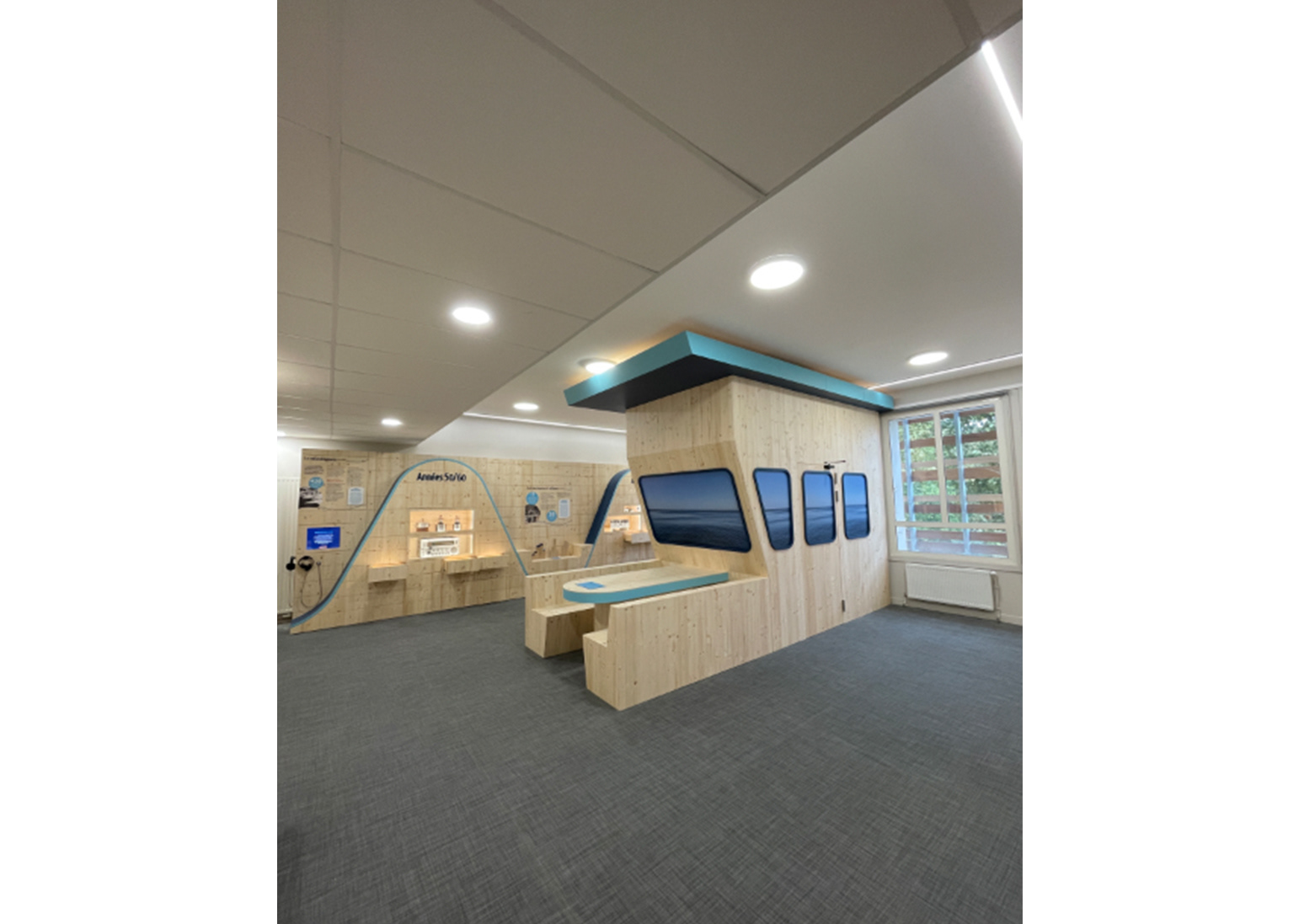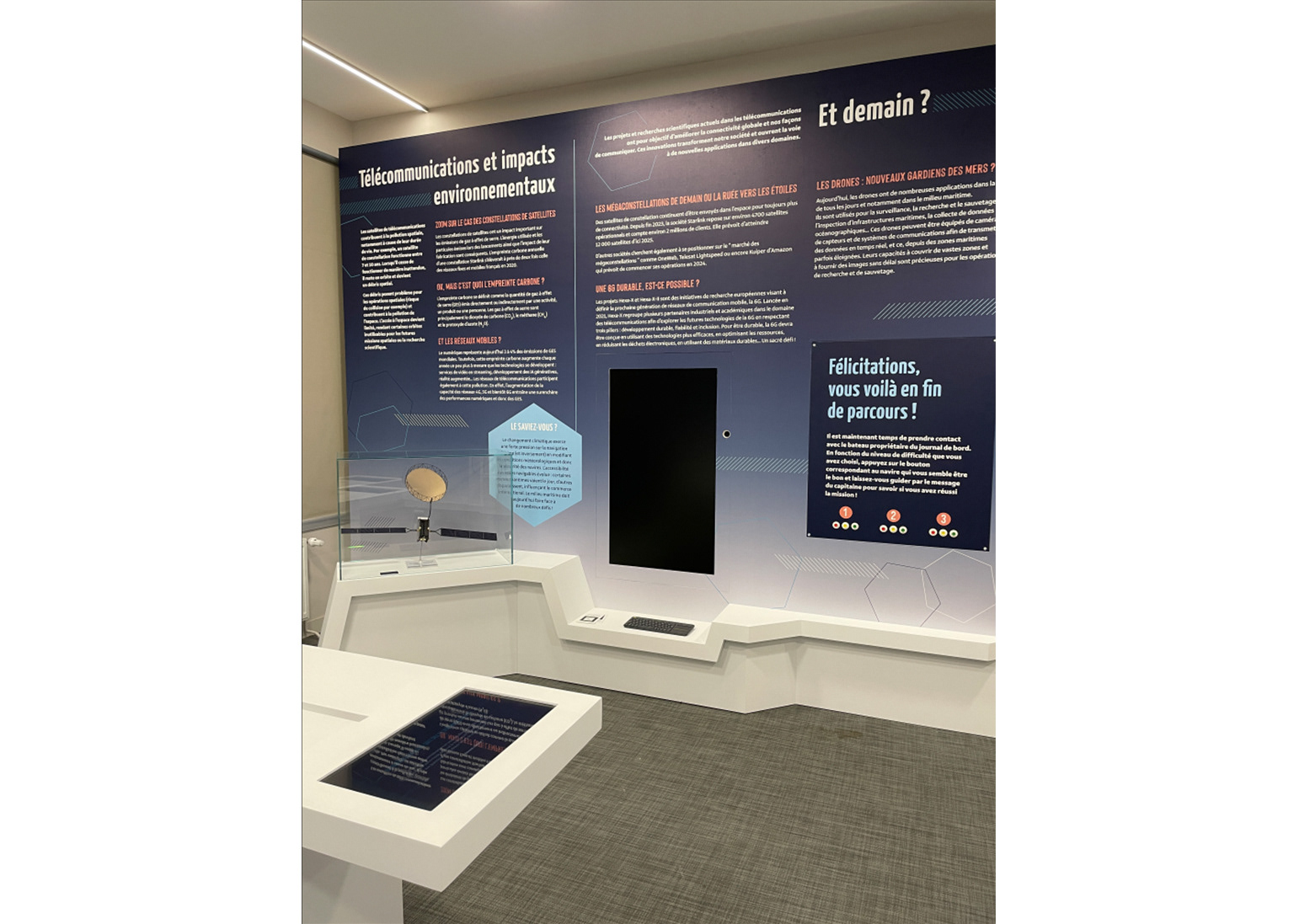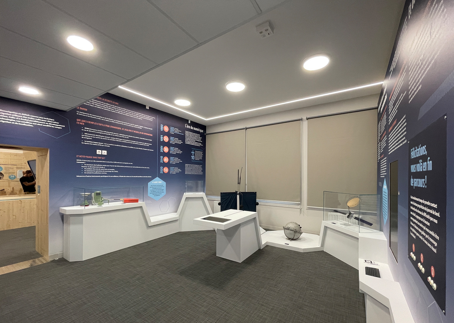 (présentation extérieure, textes de salles, cartels, lettrages, ...)